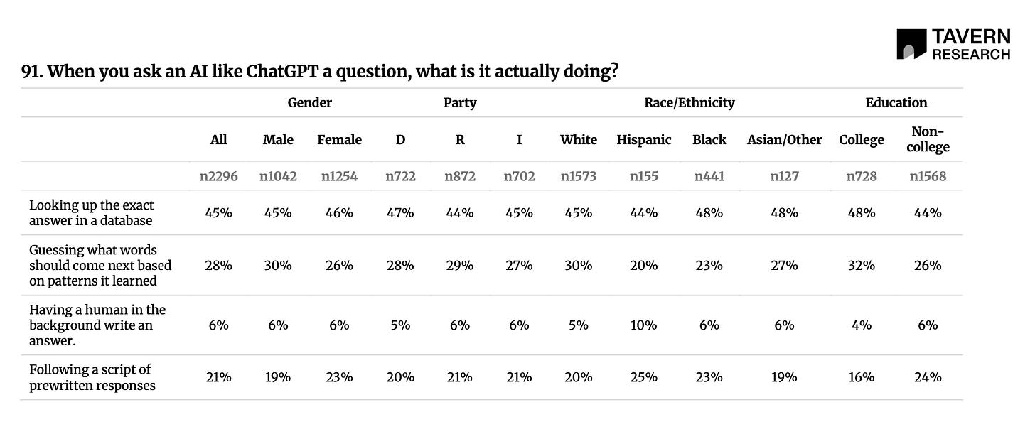 But most people, including mainstream journalists, typically have better things to do than reading those Substacks, and so for them, AI progress remains quite illegible. This is partly because recent AI progress is, indeed, fairly ephemeral. As Clark says: “I walk around the town in which I live and there aren’t drones in the sky or self-driving cars or sidewalk robots or anything like that.” So far, progress in general-purpose AI is mostly a software revolution, which is inherently harder to grasp than a home robot. For example, respondents in a recent survey said that when you ask an LLM a question, it looks up the exact answer in a database (45%), follows a set of prewritten responses (21%) or a human in the background is writing the answer (6%). At least according to this survey, it’s not clear to most of the public that modern AI models are doing something much more impressive than that (even if it’s hard to say how the models are doing it).