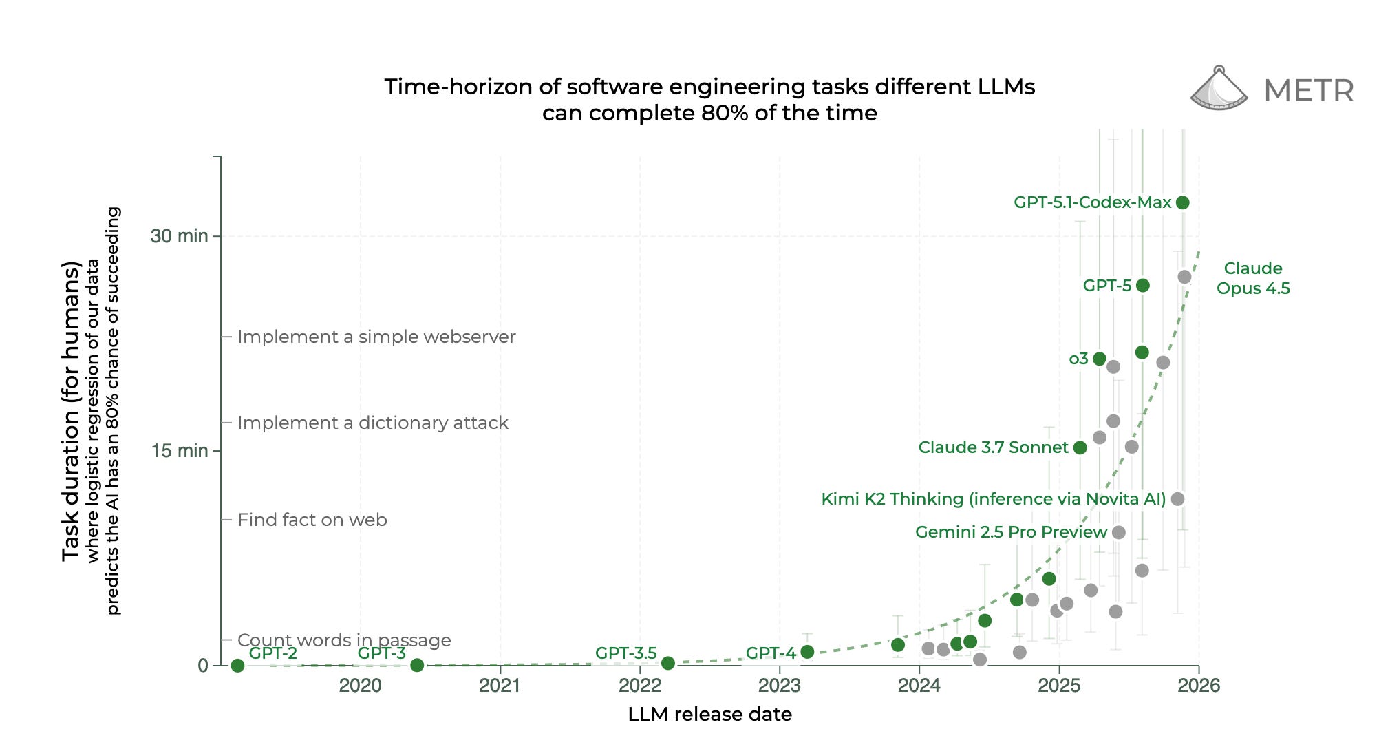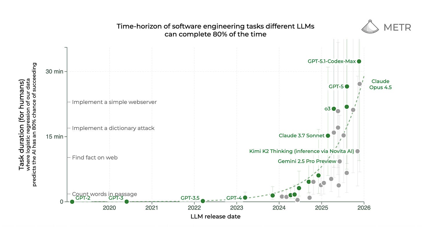 In 2025, AI progress continued to be very rapid. Benchmark performance followed exponential trendlines, most notably in the METR study on task horizons. Real-world impact, however, mostly materialized in coding agents, maths olympiads and arcane corners of modern science – and so was largely hidden in sight. At least for now, this has nothing to do with important information being classified, as some people feared in 2024 when AI discourse became increasingly securitized. In fact, the knowledge is basically out there if you read the right Substacks, or as Jack Clark put it: “[I]f you have a bit of intellectual curiosity and some time, you can very quickly shock yourself with how amazingly capable modern AI systems are.”